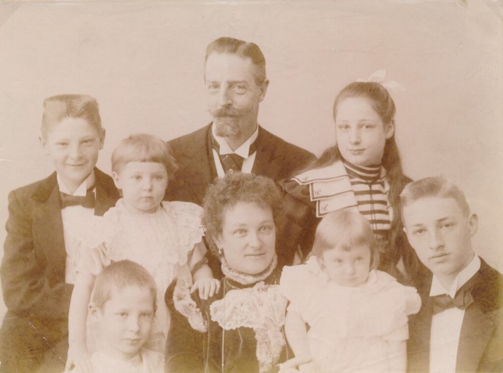 Hendrik ja Lucy van der Gilse van der Pals lapsineen. Leopold van der Pals oikealla. Kuva on noin vuodelta 1900. Lohjan Museo.