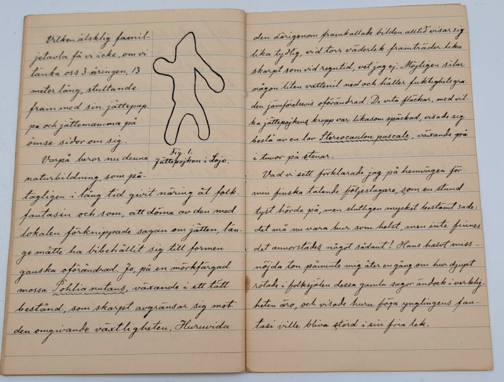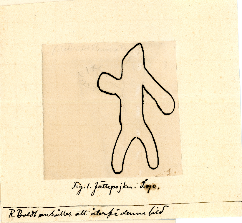 Robert Boldt upptecknade denna historia som berättats länge i Lojo och publicerade den i tidskrifter Hembygden år 1910.Han besökte själv platsen och gjorde noggranna anteckningar. Han ritade också av ”jätten” men trodde själv att ”naturbildningen” berodde på mossa och lav.