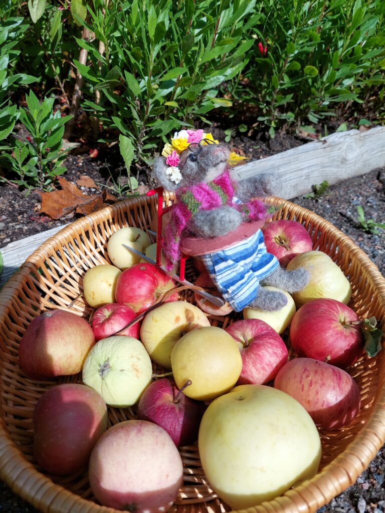 Jag tycker också om att vara ute i naturen. Där finns många fina platser som stora stenar, grottor och gamla träd. Jag brukar plocka allt som är vackert: stenar, nötter, ekollon, kastanjer och kottar.I Stora prästgårdens trädgård finns det goda saker. Äppel är mums och det har alltid funnits många fruktodlingar här i Lojo. Av äpplen kan man göra mycket: äppelbröd, äppelmos, äppelmust och torkade äpplen. Många som var barn förr berättar om bus, som när de knyckte äpplen från grannens trädgård. Ibland var äpplena kvar, men äppelkorgen var stulen.