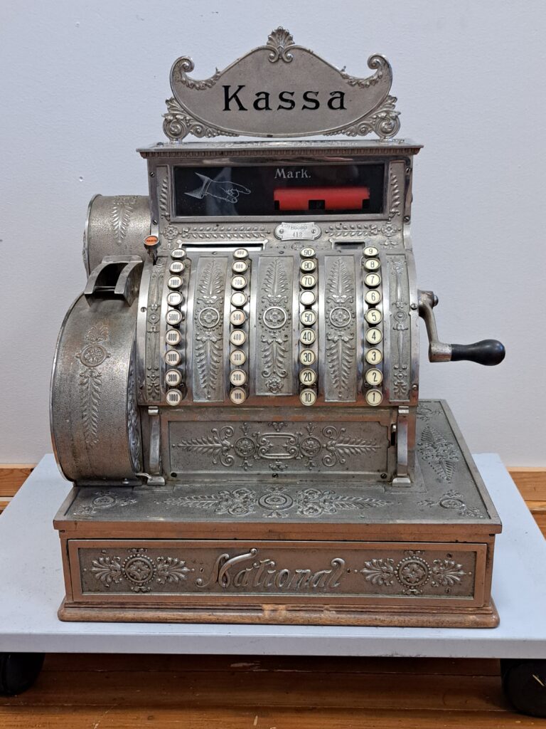Klink, klonk! Dörrklockan klämtar och en liten flicka och hennes storebror kommer in i butiken. Pojken har en sedel i ena handen och en mjölkkanna i den andra. Nuförtiden betalar man med pengar, men förr kunde man betala med skinn eller salt. Barnen tittar på de fina leksakerna bredvid trappan till nedre våningen. Jag smyger iväg till köttdisken för att snusa lite närmare. Mmm, knackkorvar i långa stänglar, det är gott!