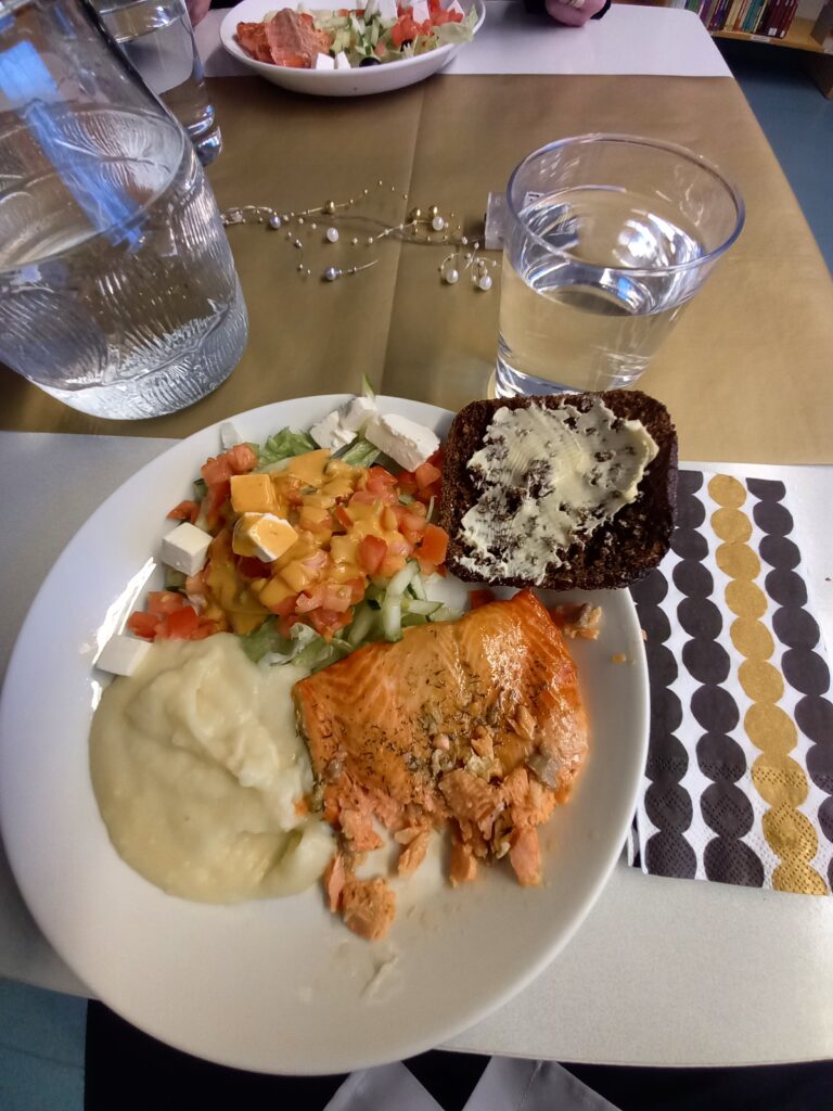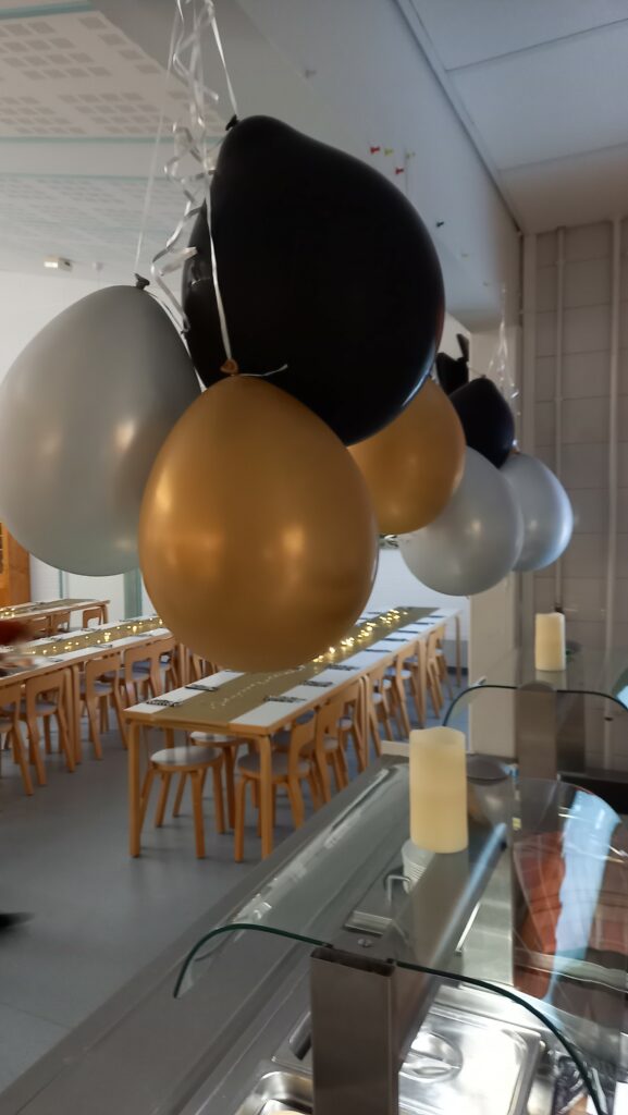 Juhlalounas kouluille ja päiväkodeille Lohjan 700-vuotisjuhlan ja kouluruoan 75-vuotisjuhlan kunniaksi 24.11.2023 Lohjan kouluissa ja päiväkodeissa vietettiin Lohja700-vuotta sekä Kouluruoan 75-vuotisjuhlaa juhlalounaan merkeissä. Juhlaruoka toteutettiin yhteistyössä koulujen ja päiväkotien kanssa. Ruokasalit koristeltiin kultaisin pöytäliinoin, kauniiden serviettien ja ilmapallojen kera. Pöydät katettiin ja koristeltiin kauniisti ja taustalla soi musiikki. Juhlalounas kattaus Pusulan koulussa Ruokana tarjoilimme uunilohta, perunasosetta sekä komponentteina kreikkalaistyylisen salaatin sekä saaristolaisleivän. Jälkkärinä oli jäätelö. Juhlalounas annos Kiitos ruoka- ja siivouspalvelun henkilökunnalle järjestelyistä ja mukana koristelussa olleille asiakkaille ja oppilaille. kuvat ovat Metsolan- ja Pusulan kouluista. Juhlalounaan koristelu