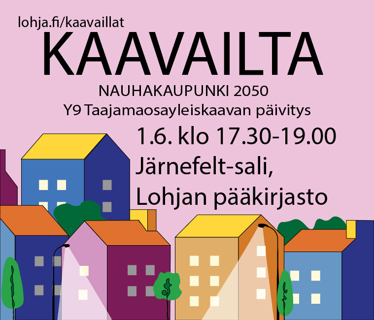 Tervetuloa torstaina 1.6. Lohjan pääkirjaston Järnefelt-saliin Nauhakaupunki 2050 -osayleiskaavaan keskittyvään kaavailtaan! Tilaisuus alkaa kaavatyön esittelyllä klo 17.30, minkä jälkeen voi keskustella kaavoituksen henkilökunnan kanssa. Nauhakaupunki 2050 -kaava kulkee myös nimellä Y9 Taajamaosayleiskaavan päivitys.