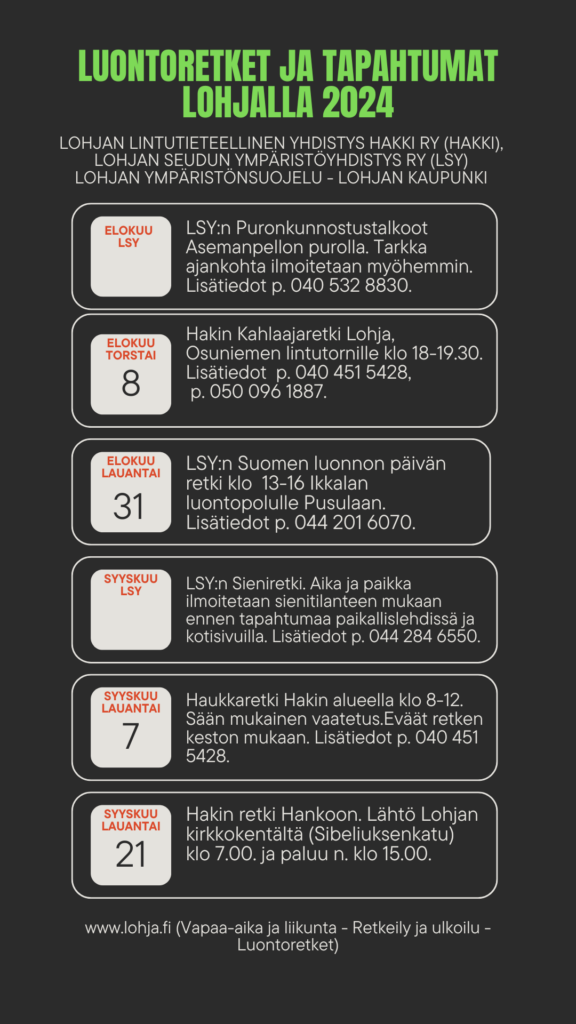 Retkiohjelmaan saattaa tulla muutoksia ja myös kellonaikoihin tarkennuksia. Seuraa paikallislehtien tapahtumapalstoja, www.lohja.fi, www.sll.fi/lohja tai www.hakkilohja.fi ilmoittelua.