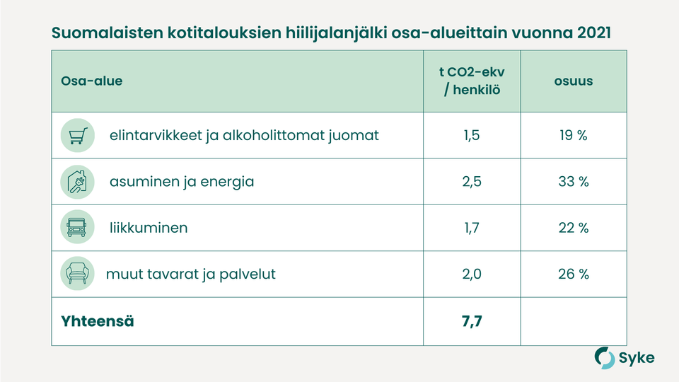 Kuva: Suomalaisten kotitalouksien hiilijalanjälki osa-alueittain vuonna 2021. Suomen ympäristökeskus
