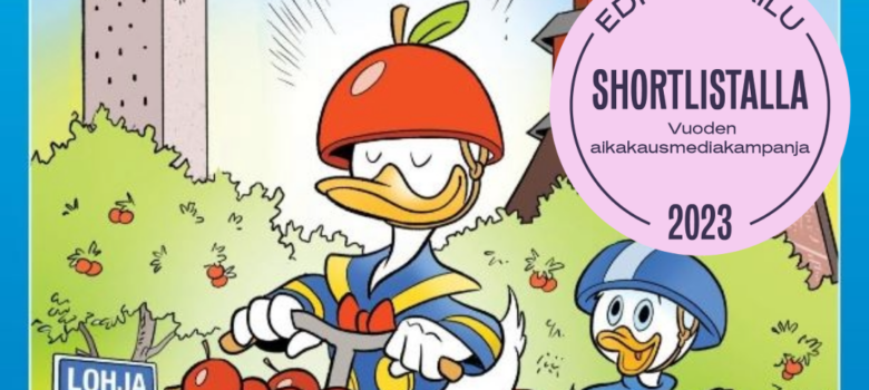 Lohjan Aku Ankka voitti Aikakausmedian Edit-kilpailussa 17.5.2024 Lohjalle Lompsis Aku Ankan liite on voittanut Aikakausmedian arvostetun Edit-kilpailun Vuoden aikakausmediakampanja -sarjan! Vuoden aikakausmediakampanjaksi valittiin Lohjan kaupungin yhteistyössä Sanoma Media Finlandin kanssa suunniteltu Lohjalle lompsis -mainosliite. Liite julkaistiin Aku Ankan välissä ja sitä jaettiin myös Lohjan kaupungin eri tapahtumissa ja palvelupisteissä 700-vuotiaan Lohjan juhlavuoden aikana. Tuomariston mukaan hauska ja hallittu kampanja on piristävä poikkeus kaupunkimarkkinoinnissa. Mainostaja on uskaltanut luottaa yhteen, huolellisesti tehtyyn ideaan. – Oivaltava brändiyhteistyö tavoitti lapsiperhekohderyhmän mieleenpainuvalla tavalla, ja laadukkaalla printtiliitteellä Lohja varmisti pitkäkestoisen yhteyden lukijoihin, tuomaristo perustelee. Kiitos kaikille, jotka olivat mukana Akun suunnittelussa! Voit lukea Aku Ankan täältä.