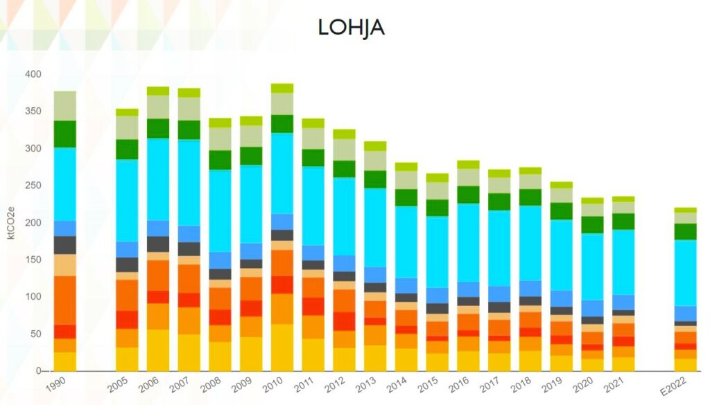 Lohjan kasvihuonekaasupäästöt vähenivät ennakkotietojen mukaan 6,4 % vuonna 2022 13.12.2023 SYKE:n ennakkotietojen mukaan kuntien keskimääräinen päästövähennystavoite vuonna 2022 jäi toivotusta, mutta Lohjan päästöt vähenivät vuodentakaiseen merkittävästi. Lohjan päästökehitys 1990-2022 (ennuste), Hinku-laskenta ilman päästöhyvityksiä Suomen päästövähennyskehitys jäljessä toivotusta vauhdista Suomen ympäristökeskus (SYKE) julkaisi marraskuun lopulla ennakkotiedot kuntien vuoden 2022 kasvihuonekaasu-päästötuloksista. Raportin mukaan Lohja on onnistunut vähentämään päästöjään edellisvuodesta melko hyvin; 6,4%. Kuntien keskimääräinen päästöjen vähennys oli hieman ennakoitua pienempi, 2,7%, mutta osoittaa päästökehityksen olevan laskusuuntainen. Päästöjen vähentäminen on tärkein osa ilmastonmuutoksen torjuntaa. Kunnat ovat erityisen keskeisessä asemassa tässä työssä, sillä ne voivat vaikuttaa päästöjen kannalta merkittäviin yhteiskunnan toimintoihin. Kuntien vuoden 2022 keskimääräinen päästökehitys on toivottua hieman hitaampaa, mikä johtuu mm. Venäjän hyökkäyssodan aiheuttamista laajoista vaikutuksista energiasektorille. Pitkällä aikavälillä voidaan kuitenkin odottaa positiivista kehitystä, sillä siirtymä kohti uusiutuvaa energiaa kiihtyi viime talven energiakriisin vuoksi. Lohjalla päästöt vähenivät vuonna 2022 maan keskiarvoa enemmän, mutta 80 %:n tavoitteeseen on vielä matkaa Vaikka Suomessa ei keskimäärin saatu suuria päästövähennyksiä viime vuonna, Lohjalla vauhti oli kuitenkin hyvää. Ennakkotietojen mukaan päästöt laskivat vuonna 2022 erityisen paljon sähkön ja lämmityksen päästöissä. Liikenteen päästöt sen sijaan hieman kasvoivat vuoden takaisesta määrästä. Lohja kuuluu Kohti hiilineutraalia kuntaa -verkostoon ja on sen myötä asettanut itselleen päästövähennystavoitteen, jonka mukaisesti se tavoittelee 80% päästövähennyksiä vuoteen 2030 mennessä verrattuna 2007 vuoden päästötasoon. SYKE:n ennakkotietojen perusteella Lohja on onnistunut vähentämään päästöjä 42% vuoden 2007 tasosta, joten tavoitteeseen on vielä runsaasti matkaa. Ennakkotietojen mukaan Lohjan päästömäärä vuonna 2022 oli 220,7 kt CO2e. Onnistunutta päästökehitystä on vuoteen 2007 verrattuna tapahtunut erityisesti teollisuuden (-64,7%), kulutussähkön (-66,7%), lämmityksen (jopa -65,5%), raideliikenteen (-57,1%) ja jätteidenkäsittelyn (-53,5%) sektoreilla. Päästöt ovat vähentyneet hitaasti sen sijaan työkoneiden (-7,7%), tieliikenteen (-23,0%) ja maatalouden (-14,7%) sektoreilla. Päästöjen jakautuminen sektoreittain vuonna 2022 (ennuste), Hinku-laskenta ilman päästöhyvityksiä Lohjan kaupungin päätös tukea joukkoliikenteen kehittämistä lähivuosina edistää tieliikenteen päästövähennystavoitetta. Myös kaupungin panostukset fossiilittomaan kaukolämpöön ovat tärkeitä päästötavoitteen toteutumisen kannalta. SYKE:n julkaisemat päästötiedot ovat ennusteita ja tulokset saattavat vielä muuttua. Tarkemmat tiedot toteutuneista vuoden 2022 päästöistä julkaistaan keväällä 2024. Päästötiedot on saatu Hinku-laskentamekanismilla, joka ei sisällä päästöhyvityksiä, päästökauppaan kuuluvien teollisuuslaitosten polttoaineiden käyttöä, teollisuuden sähkönkulutusta, teollisuuden jätteiden käsittelyn päästöjä eikä kuorma-, paketti- ja linja-autojen läpiajoliikennettä. Lohjan päästökehitykseen voi tutustua tarkemmin täältä (linkki johtaa SYKE:n sivulle). Lisätiedot: Projektikoordinaattori Meeri Hartonen, meeri.hartonen@lohja.fi Kehittämispäällikkö Meliina Partio, meliina.partio@lohja.fi