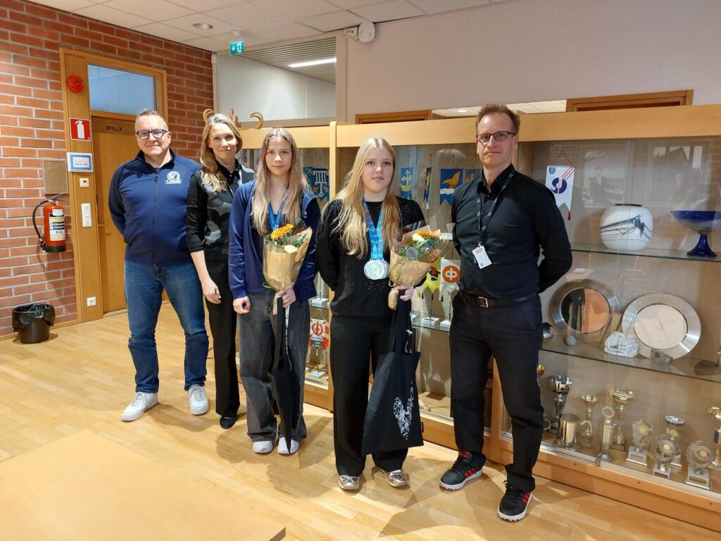 Mitalikahvit lohjalaisille nuorille urheilijoille 25.9.2025 Minni Hormavirralle ja Sofia Pekille järjestettiin Lohjan kaupungintalolla mitalikahvit 25.9.2025. Hormavirta voitti heinäkuussa nuorten alle 17-vuotiaiden painonnoston EM-kisoissa hopeaa ja Pekki kesäkuussa judon alle 18-vuotiaiden EM-kilpailuissa kultaa. Lohjan kaupunki onnittelee lämpimästi molempia urheilijoita! Kuvassa vasemmalta oikealle Lohjan Liikuntakeskuksen Jukka Vienonen, kaupunginjohtaja Petra Ståhl, urheilijat Sofia Pekki ja Minni Hormavirta sekä sivistysjohtaja Juha-Pekka Lehmus.