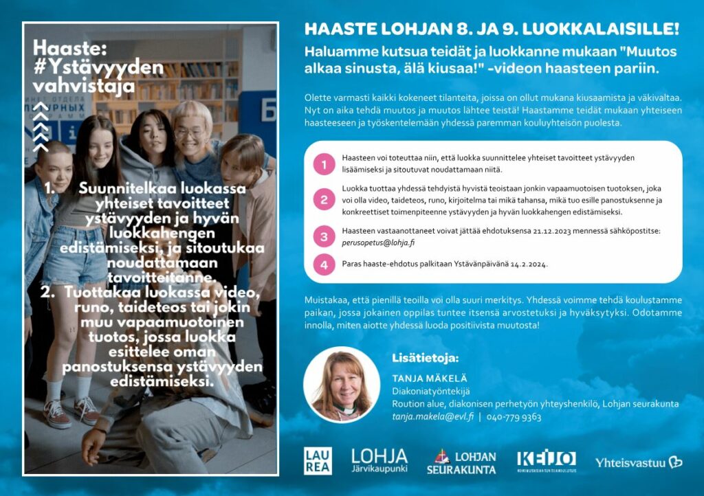 Muutos alkaa sinusta, älä kiusaa! – Haaste Lohjan 8.–9.-luokkaisille 1.12.2023 Haastamme kaikki Lohjan 8.–9.-luokkaiset mukaan yhteiseen haasteeseen ja työskentelemään yhdessä paremman kouluyhteisön puolesta. Haasteen voi toteuttaa niin, että luokka suunnittelee yhteiset tavoitteet ystävyyden lisäämiseksi ja sitoutuu noudattamaan niitä. Luokka tuottaa yhdessä tehdyistä hyvistä teoistaan jonkin vapaamuotoisen tuotoksen, joka voi olla video, taideteos, runo, kirjoitelma tai mikä tahansa, mikä tuo esille panostuksenne ja konkreettiset toimenpiteenne ystävyyden ja hyvän luokkahengen edistämiseksi. Haasteen vastaanottaneet voivat jättää ehdotuksensa 26.1. mennessä sähköpostitse perusopetus@lohja.fi. Paras haaste-ehdotus palkitaan Ystävänpäivänä 14.2.2024. Muistakaa, että pienillä teoilla voi olla suuri merkitys. Yhdessä voimme tehdä koulustamme paikan, jossa jokainen oppilas tuntee itsensä arvostetuksi ja hyväksytyksi. Odotamme innolla, miten aiotte yhdessä luoda positiivista muutosta! Katso haastevideo täältä Muutos alkaa sinusta – älä kiusaa! -video on toteutettu Yhteisvastuu keräyksen varoilla yhteistyössä Lohjan seurakunnan, Lohjan kaupungin, KEIJO-kokemusasiantuntijakoulutuksen ja Laurea-ammattikorkeakoulun kanssa. Videon finns inte på svenska, istället kommer Källhagens skolas 8. och 9.-klassister att få ett live-besök av några av personerna på videon. Källhagens elever får givetvis också delta i utmaningen och komma med förslag på positiv förändring!t Lisätietoja:Tanja MäkeläDiakoniatyöntekijä, Lohjan seurakuntatanja.makela@evl.fipuh. 040 779 9363