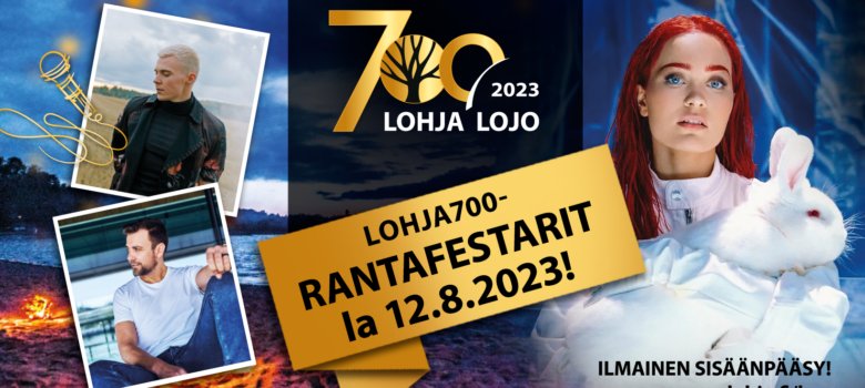 Tervetuloa juhlimaan Lohjan 700-vuotissynttäreitä! 24.7.2023 Tule mukaamme juhlimaan Lohjan 700-vuotistaivalta! Juhlavuosi huipentuu elokuussa 10.–13.8.2023 vietettävään pääjuhlaan, jolloin tapahtumia riittää niin kulttuurinystävälle kuin festivaalikävijälle. Kaikki tapahtumat ovat maksuttomia ja avoimia kaikille. Pääjuhlan ohjelma löytyy kokonaisuudessaan täältä. Lohja700-rantafestarit Aurlahdessa lauantaina 12.8. Lauantaina 12.8. järjestetään kaikille suunnattu, maksuton kesäfestari Aurlahden rannassa klo 10 alkaen. Mukana muun muassa mahtavia lohjalaistaustaisia esiintyjiä, kuten Juha Lehti, Antti Ketonen ja Elias Kaskinen. Festareilla esiintyy myös paikallinen bändi Safetybox. Esiintyjiä tahdittaa Lohjan kaupunginorkesteri. Ilta huipentuu Sannin keikkaan! Koko päivän tarjolla on myös herkullista ruokaa ja juomaa sekä aktiviteetteja kaiken ikäisille. Lue lisää rantafestareista täältä. Lohjan kaupunki järjestää juhlaliputuksen 12.–13.8.2023 Lohjan 700-vuotisjuhlatyöryhmä on päättänyt, että Lohja700-juhlavuoden pääjuhlan aikaan järjestetään liputus. Liputus alkaa lauantaina klo 8 ja päättyy sunnuntaina klo 21. Liputuksessa tulee noudattaa liputusaikoja. Voimassa olevan asetuksen mukaan Suomessa liputus alkaa aamulla kello 8 ja päättyy auringon laskiessa, kesällä kuitenkin viimeistään kello 21. Kannustamme kaikkia lohjalaisia osallistumaan liputukseen.