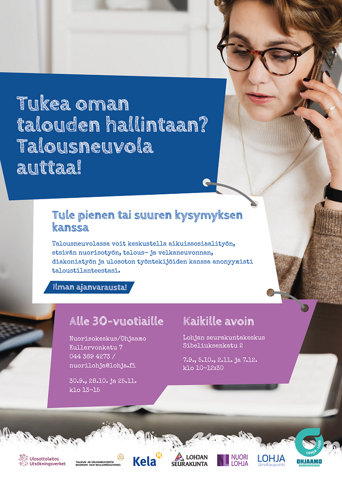 Tukea oman talouden hallintaan? 15.9.2021 Talousneuvola auttaa pienissä ja suurissa talouskysymyksissä. Talousneuvolassa voit keskustella aikuissosiaalityön, etsivän nuorisotyön, talous- ja velkaneuvonnan, diakoniatyön ja ulosoton työntekijöiden kanssa anonyymisti taloustilanteestasi.Neuvontapalvelut ovat käytettävissäsi maksutta, nimettömänä ja ilman ajanvarausta. Alle 30-vuotiaiden neuvontapalvelut Nuorisokeskus/OhjaamoKullervonkatu 7, Lohjap. 044 369 4273 30.9.,28.10 ja 25.11.klo 13-15 Kaikille avoimet neuvontapalvelut Lohjan seurakuntakeskusSibeliuksenkatu 2, Lohja5.10.,2.11. ja 7.12.klo 10-12.30 Tervetuloa!