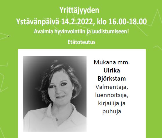 Yrittäjyyden ystävänpäivä -verkkotapahtuma 14.2.2022 10.2.2022 Yrittäjille ohjelmaa hyvinvoinnin ja uudistumisen teemoilla. Ystävänpäivänä 14.2.2022 on yrittäjille ohjelmaa hyvinvoinnin ja uudistumisen teemoilla. Tutustut yrittäjyyttä tukeviin verkostoihin Länsi-Uudenmaan alueella. Ohjelmassa on mielenkiintoisia puheenvuoroja paikallisilta yrittäjiltä sekä Ulrika Björkstamin puheenvuoro Resilienssi – avain hyvinvointiin ja muutokseen. Ulrika Björkstam on tunnettu valmentaja, luennoitsija, kirjailija ja puhuja. Tilaisuus on toteutettu verkkotapahtumana, tule mukaan! Aika: maanantaina 14.2.2022 klo 16-18.Paikka: Etätoteutus verkossaTilaisuuden juontaa Paula Mäkelä, Positiivinen Potentiaali Voit ilmoittautua mukaan linkistä: https://link.webropolsurveys.com/S/9A99BC2A887E9343Tervetuloa!