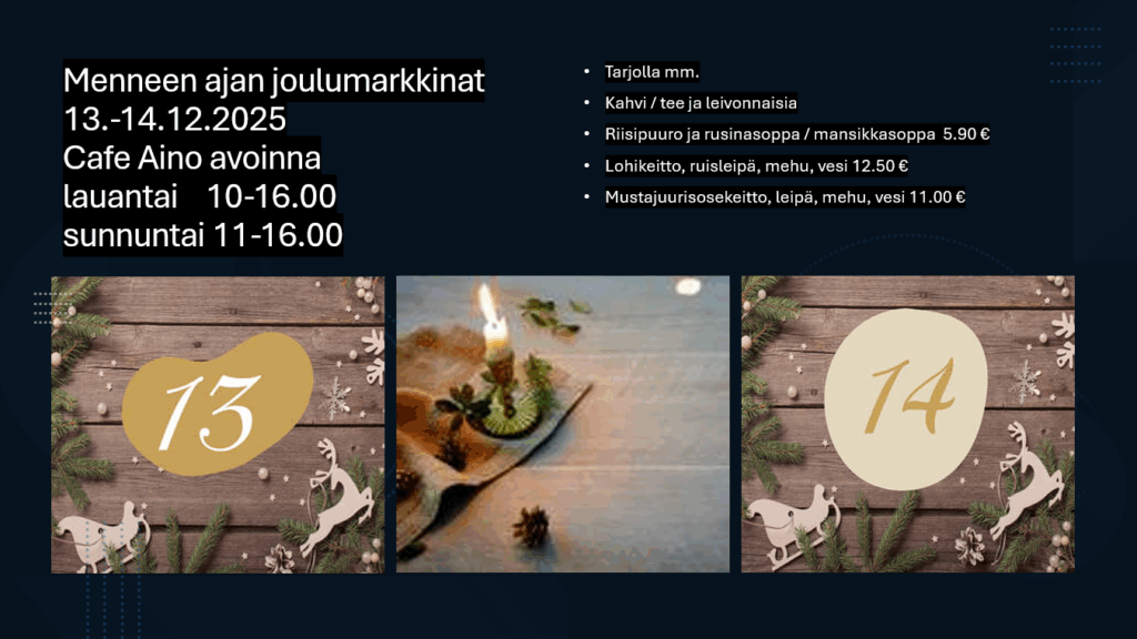 Cafe Aino on mukana kaikenlaisissa tapahtumissa, kuten Menneen ajan joulumarkkinoilla la 13.12. klo 10-16 ja su 14.12. klo 11-16.
