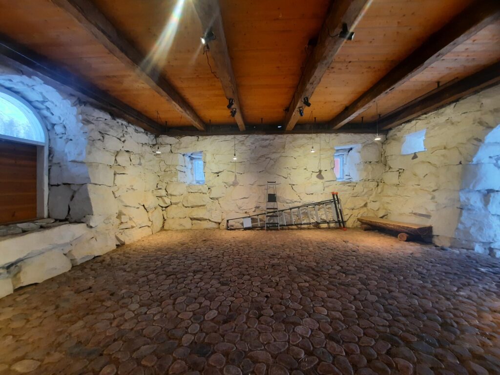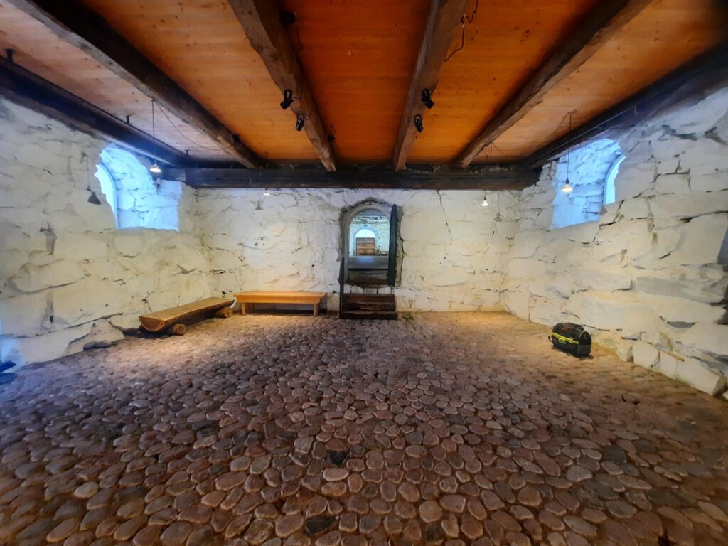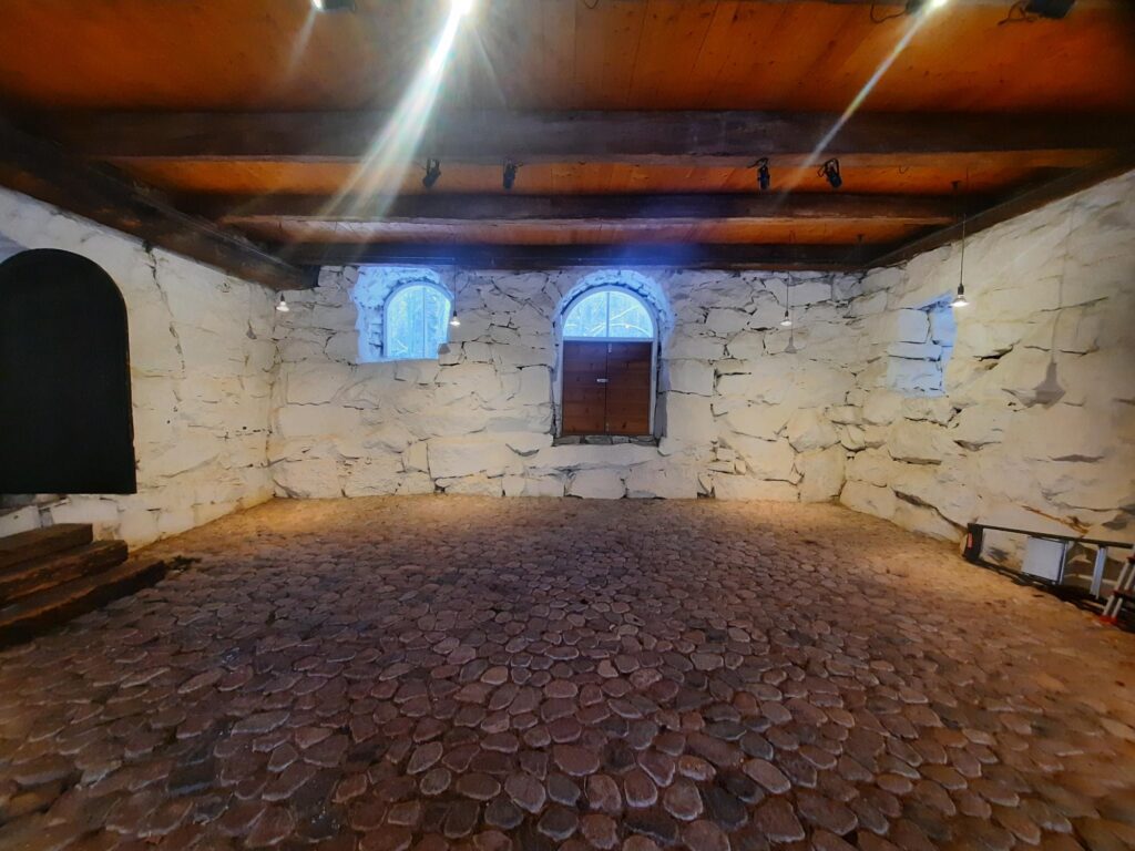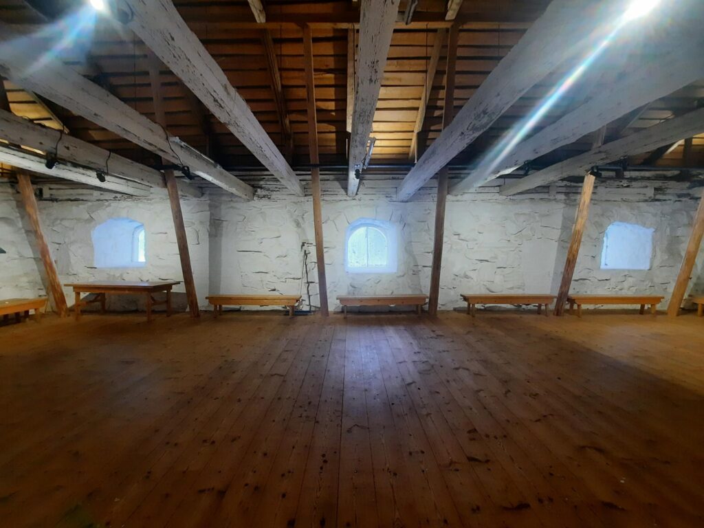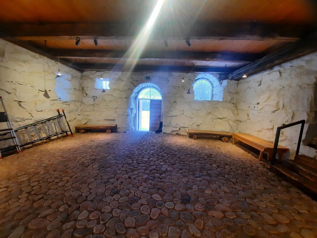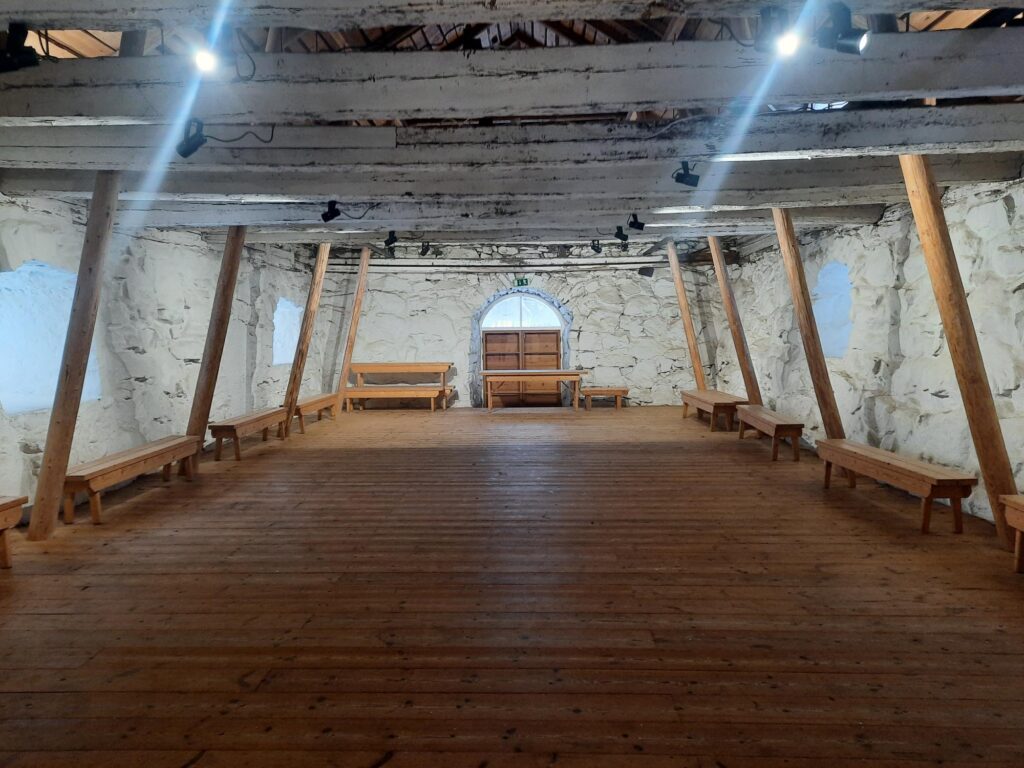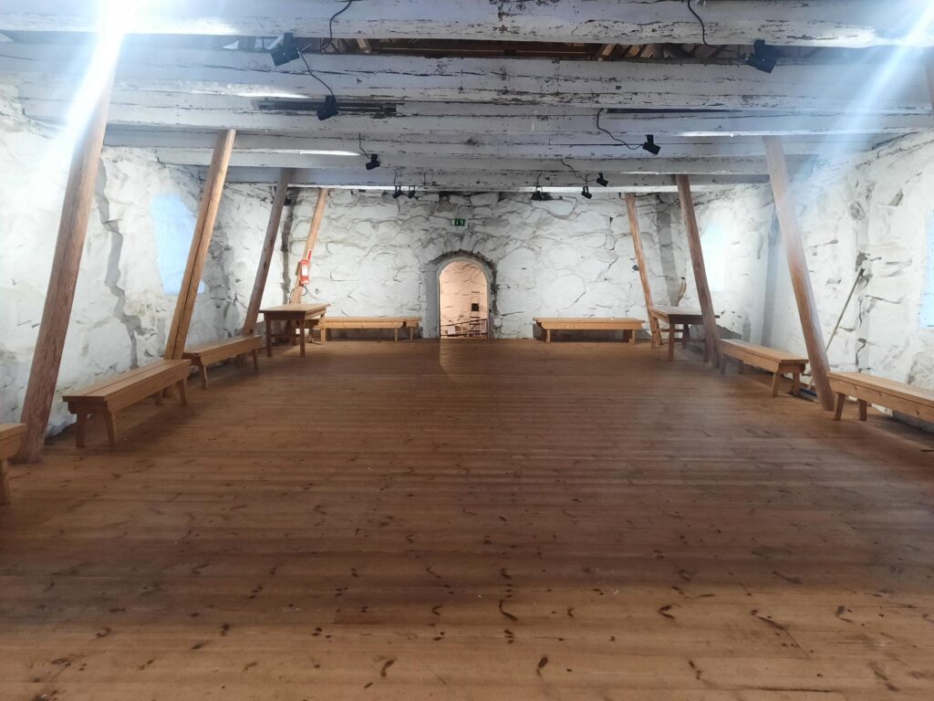 Tilojen seinien yläosaa kiertää ripustustanko, josta muun muassa taulut voi ripustaa. Salin valkoiseksi kalkitut vaakaparrut kantavat 40 kg/m.