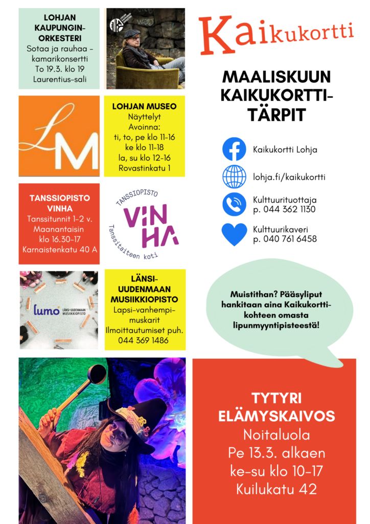 Lohjan Kaikukortti-toiminnan vastuuhenkilö: Sara Ertek kulttuurituottaja puh. 044 362 1130 sara.ertek@lohja.fi
