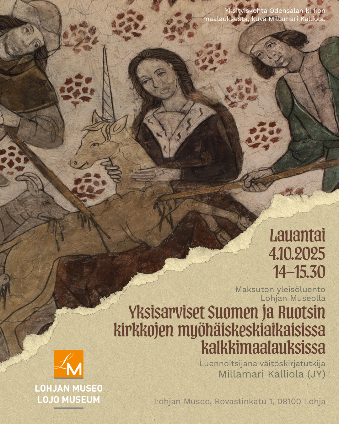 Luennoitsijana on väitöskirjatutkija Millamari Kalliola, joka tutkii taidehistorian väitöskirjassaan yksisarvisaihetta Suomen ja Ruotsin myöhäiskeskiaikaisissa kirkkomaalauksissa.