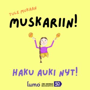 8.12.2022 Muskariin kevätkaudeksi! Otamme uusia 0–8-vuotiaita oppilaita muskareihin kevätkaudelle kaikkiin niihin ryhmiin, joissa on vielä tilaa. Laurentius-talon maanantai-aamussa klo 9 aloittaa myös uusi ryhmä 2022-syntyneille vauvoille. Lisäksi vapaita paikkoja on muissa alle 3-vuotiaiden lapsi-vanhempi -ryhmissä. Tutustu muskaritoimintaan ja etsi sopiva ryhmä! Ilmoittaudu osoitteessa lumo.eepos.fi