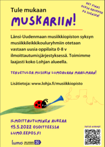 22.7.2022 Muskarin uusia ryhmiä Laurentius-talossa Lohjalla uusia ryhmiä! Maanantain klo 10.452022 syntyneiden vauvojen ryhmä. Ma klo 15.452021 syntyneille lapsille uusi iltapäiväryhmä. Tervetuloa mukaan musiikin lumoavaan maailmaan! Katso täältä kaikkien muskarien lukujärjestykset ja ilmoittaudu sopivaan ryhmään täältä