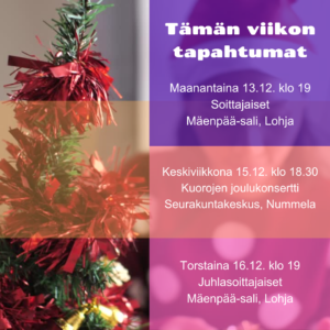 13.12.2021 Tapahtumat viikolla 49 Maanantaina 13.12. klo 19 Soittajaiset Mäenpää-sali, Lohja Keskiviikkona 15.12. klo 18.30 Kuorojen joulukonsertti Seurakuntakeskus, Nummela Kesiviikkona 15.12. Soittajaiset Torstaina 15.12. klo 19 Juhlasoittajaiset Mäenpää-sali, Lohja