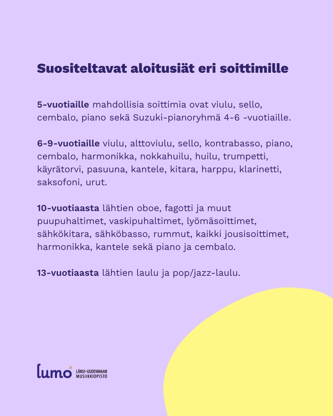 Tätä kysymystä kannattaa pohtia rauhassa ennen soitinoppilaaksi hakemista. Soittimiin voi tutustua tutustumalla soitinesittelyihin.