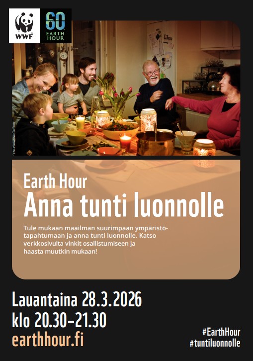 Earth Hour näkyy jälleen Lohjalla – valot sammuvat useissa kohteissa ja musiikki soi pimeässä 27.3.2026 Lohjan kaupunki on jälleen mukana Earth Hour -tapahtumassa, joka huipentuu la 28.3. klo 20.30 valojen sammuttamisella. Lohjan kaupunki osallistuu jälleen maailmanlaajuiseen Earth Hour -kampanjaan. Tapahtumaa vietetään lauantaina 28. maaliskuuta kello 20.30–21.30, jolloin valot sammuvat symbolisesti ilmaston ja luonnon puolesta. Ulkovalaistus sammutetaan tunniksi seuraavissa kohteissa: Laurentius-talo Ojamo-talo Järnefeltin koulu Ristin koulu Muijalan koulu Nummen yhtenäiskoulu kaupungintalo Monkola Lohjan pääkirjasto Tempauksella halutaan kiinnittää huomiota ilmastonmuutokseen ja luonnon monimuotoisuuden heikkenemiseen sekä kannustaa asukkaita tekemään kestävämpiä valintoja arjessaan. Earth Hour -viikko saa Lohjalla myös kulttuurisen jatkon Lohjan musiikkiopisto järjestää maanantaina 30. maaliskuuta klo 19-20 Earth Hour -teemaisen konsertin, joka esitetään poikkeuksellisesti pimeässä, ainoastaan nuottivalojen loisteessa. Tunnelmallinen konsertti kutsuu kuulijat pysähtymään musiikin äärelle ja kokemaan, miltä maailma tuntuu ilman keinovaloa. Samalla se jatkaa Earth Hourin viestiä luonnon ja kestävän elämäntavan puolesta. Voit lukea lisätietoa tapahtumasta täältä. Tule mukaan! Lohjan kaupunki kannustaa myös asukkaita, yrityksiä ja yhteisöjä osallistumaan yhteiseen ilmastohetkeen. Valojen sammuttaminen toimii muistutuksena siitä, että pienilläkin teoilla voi olla merkitystä kestävän tulevaisuuden rakentamisessa.