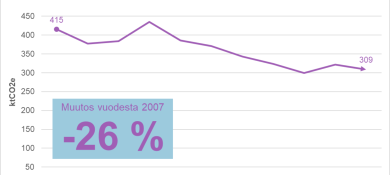 Taulukko Lohjan kokonaispäästöjen kehityksestä (muutos -26% vuodesta 2007)