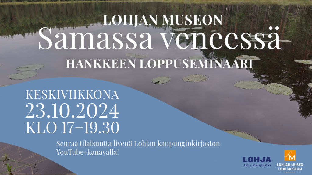 Lohjan Museon järviaiheinen Samassa veneessä -hanke on tulossa päätökseen, ja kutsumme kaikki asiasta kiinnostuneet seuraamaan hankkeen loppuseminaaria keskiviikkona 23.10. klo 17–19.30 paikan päälle Lohjan pääkirjaston Järnefeltinsaliin tai etänä live-lähetyksen äärelle Lohjan kaupunginkirjaston YouTube-kanavalle. Seminaari tallennetaan, ja tallenne on katsottavissa Lohjan kaupunginkirjaston YouTube-kanavalla kahden viikon ajan tapahtuman jälkeen.