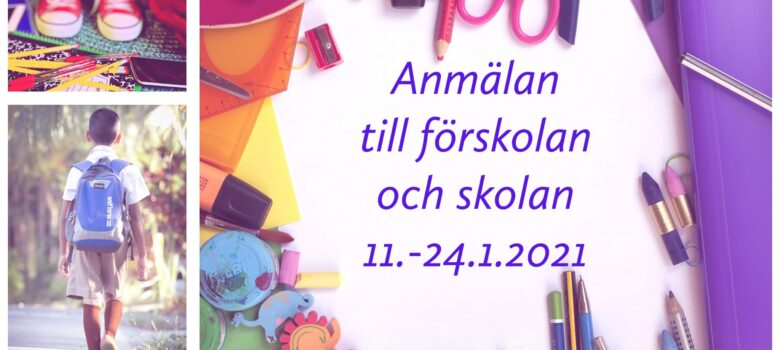 Anmälan till skolan och förskolan 11.-24.1.2021 12.1.2021 Anvisningar för hur du lämnar in anmälan får du i ett wilma meddelande. Kom ihåg att också ansöka om skoltransport- och eftisplats om det behövs. Blivande förskole eleverna får anmälningsanvisningarna hem per brev.Vårdnadshavarna till förskoleelever i förskoleundervisning i Lojo stad får anmälningsanvisningarna till Wilma under måndag 11.1.2021. Kom ihåg att också ansöka om skoltransport- och eftisplats om det behövs.Om barnet inte deltar i förskoleundervisning som ordnas av staden skickas anvisningarna hem per brev. Vårdnadshavarna till elever som övergår till årskurserna 7-9 får också anvisningarna om hur man bekräftar en plats i årskurserna 7-9 till Wilma under måndag 11.1. Läs mera