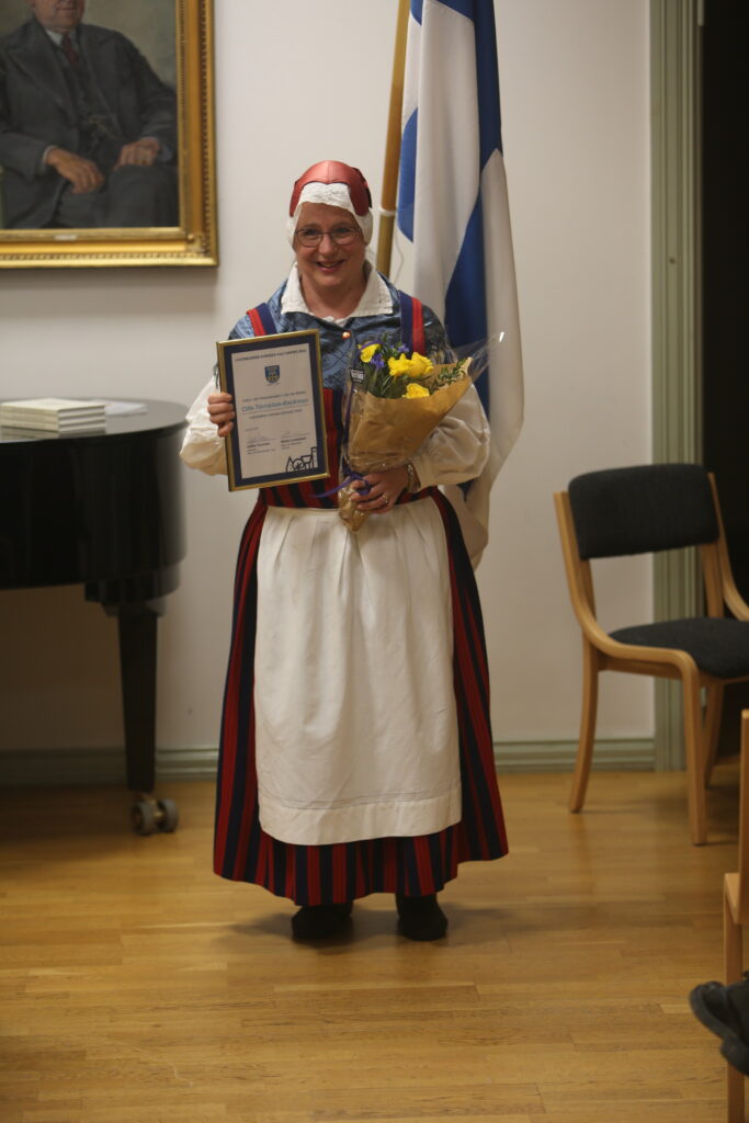 Cilla Törnblom-Backman får Lojo stads svenskspråkiga kulturpris 2024 8.11.2024 Cilla Törnblom-Backman, som jobbat med projektet Goddag – Hej på dej! på Lojo Museum, erhöll Lojo stads svenskspråkiga kulturpris på Svenska dagen festen 6.11 på Kässä gård. Priset överräcktes av kultur- och fritidsnämndens viceordförande Satu Nybäck. Under projekttiden 2023-2024 producerades ett svenskspråkigt, aktiverande pedagogiskt material riktat till daghem och skolornas lägre klasser. Målet med projektet var att berätta om hemortens historia och förstärka den lokala identiteten och att föra fram Lojos tvåspråkiga historia. Materialet går att beställa till skolor och daghem via Lojo Museum och är färdigt att användas utan handledning. Projektet genomfördes med hjälp ett understöd från Svenska kulturfonden. Foton av Ingolf Backman.
