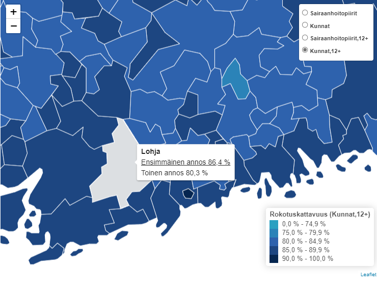 I Lojo har vi uppnått en vaccinationstäckning på mer än 80 % för personer som fyllt 12 år 15.10.2021 Coronavaccinationerna fortsätter fortfarande. Tack Lojobor!I Lojo har vi uppnått en vaccinationstäckning på mer än 80 % för personer som fyllt 12 år. Varje vaccination för oss närmare till slutet av pandemin.👍 Läs mer:https://www.thl.fi/episeuranta/rokotukset/koronarokotusten_edistyminen.html (på finska) Coronavaccinationerna fortsätter fortfarande. Vi ger coronavaccinationer i Tennari, adressen till Tennari Strandparken 45, Lojo. onsdag 20.10 kl. 9-15torsdag 21.10 kl. 9-15torsdag 28.10 kl. 9-15 Både det första vaccinet och boostervaccinet kan fås med tidsbokning eller utan tidsbokning. Intervallet mellan den första och andra vaccindosen ska vara minst sex veckor. Målgruppen för de tredje vaccinationerna är mycket begränsad. Intervallet mellan det andra och det tredje vaccinet är minst två månader för personer med svårt nedsatt immunförsvar och för personalen inom social- och hälsovården minst sex månader. Om du vill kan du tidigarelägga tiden för boostervaccination som du fått till en senare tidpunkt till dessa dagar. Du kan boka tid på adressen www.koronarokotusaika.fi. Vaccinet är Pfizer Comirnaty.Ta med ditt identitetsbevis eller FPA -kort. Förutom de som bor i Lojo är de som studerar i Lojo välkomna till vaccination. Den som ska vaccineras ska ha fyllt 12 år.