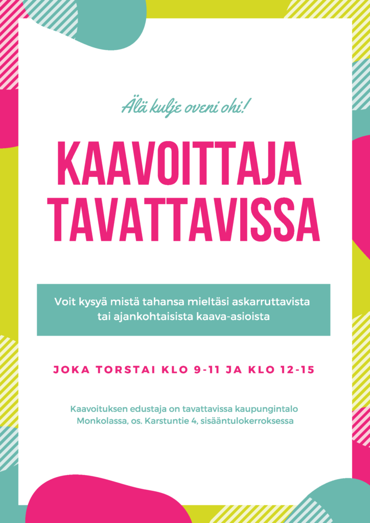 Infokväll om planer 28.1.2020 i Järnefeltsalen på huvudbiblioteket 23.1.2020 Torsdagar med planläggaren anträffbar fortsätter i möteslokalen i entréhallen i Monkola Välkommen till en infokväll om planer tisdag 28.1.2020 kl. 17.30 -19.00 i Järnefeltsalen på Lojo huvudbibliotek (Karstuvägen 3, 08100 Lojo). Infokvällen är avsedd för invånare, aktörer och andra som är intresserade av planläggning med möjlighet att under lediga former ta del av materialet om de ovan nämnda planerna och diskutera personligen med dem som utarbetat planerna. Temat för infokvällen 28.1.2020 är Y7 Ändring av delgeneralplanen för de södra delarna i Nummi-Pusula (direktbanan Esbo-Salo) och Y8 ändringen av delgeneralplanen för de norra delarna i Sammatti (direktbanan Esbo-Salo). De övriga infokvällarna under år 2020 äger rum tisdagarna 10.3.2020, 21.4.2020, 9.6.2020, 18.8.2020, 29.9.2020 och 10.11.2020. Torsdagar med planläggaren anträffbar fortsätter i mötesrummet Liiteri på entrévåningen i Monkola. Du kan fråga om vad som helst som du funderar på eller om aktuella planfrågor. Planläggningspersonalen turas om att vara på plats torsdagar kl. 9-11 och 12-15. Välkommen!