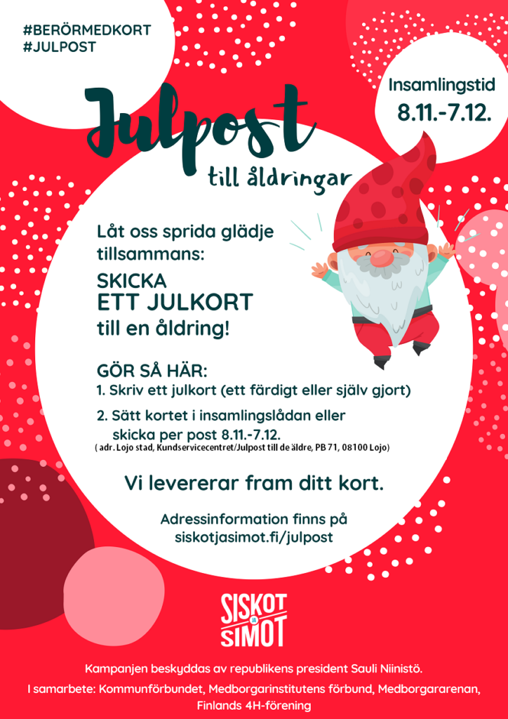 Kampanjen Julpost till de äldre i Lojo 8.11-7.12.2021 3.11.2021 Kom med i den här kampanjen för att sprida välvilja och julglädje för de äldre! Lojo stad är även i år med i kampanjen Julpost till de äldre. Syftet är att ge julkort till boende vid boendeserviceenheterna för seniorer i Lojo och klienter inom hemvården. Kort kan lämnas i insamlingsboxar som finns i närbiblioteken i Lojo och vid kundservicen i stadshuset Monkola. Man kan också skicka dem per post om man inte kan lämna dem själv (adr. Lojo stad, Kundservicecentret/Julpost till de äldre, PB 71, 08100 Lojo).Julkorten levereras från insamlingsställena så att de är framme före jul till glädje för seniorerna ! Som samarbetspartner för kampanjen fungerar Siskot ja Simot rf, Kommunförbundet, Medborgarinstitutens förbund, Medborgararenan och Finlands 4H-förening. Kampanjen beskyddas av republikens president Sauli Niinistö. Alla tiders gladaste kampanj startar nu ! Siskot ja Simot på svenska