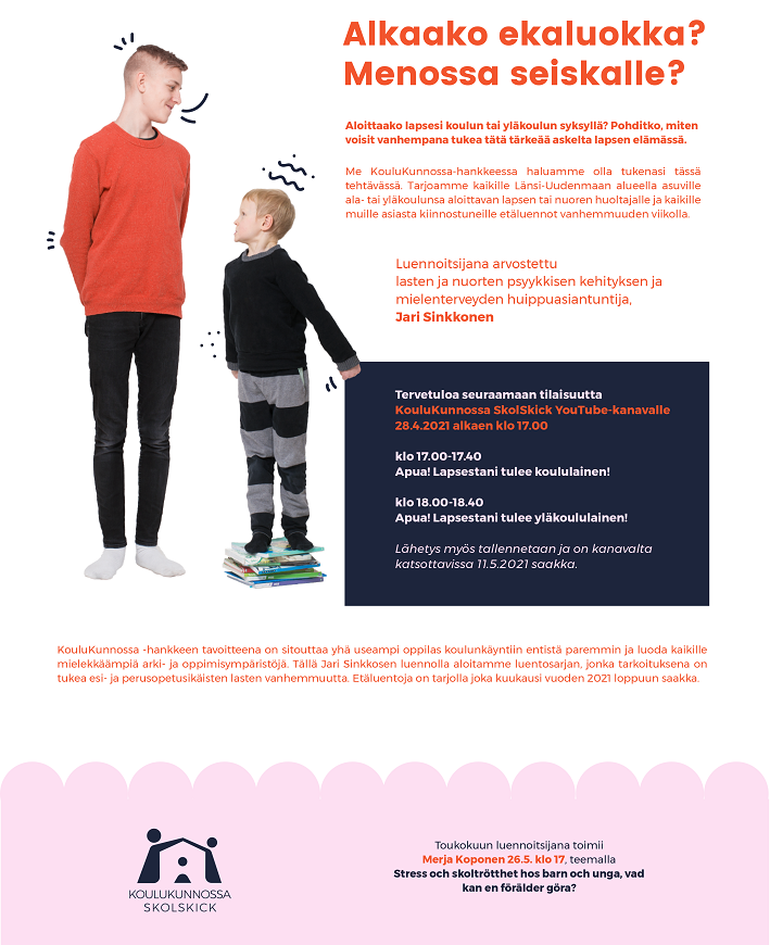 Syftet med projektet KouluKunnossa – SkolSkick är att få allt fler elever mer engagerade i skolgången och skapa mer meningsfulla vardags- och inlärningsmiljöer för alla. Med denna föreläsning av Jari Sinkkonen startar vi en serie föreläsningar, vars syfte är att stödja föräldrarna till barn i förskole- och grundskoleåldern. Distansföreläsningar kommer att erbjudas varje månad fram till slutet av 2021.
