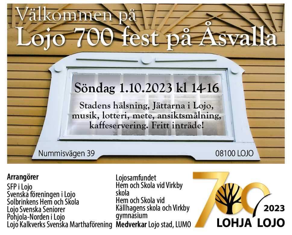 Välkommen att den svenska Lojo700-festen på Åsvalla söndagen den första oktober kl 14–16.