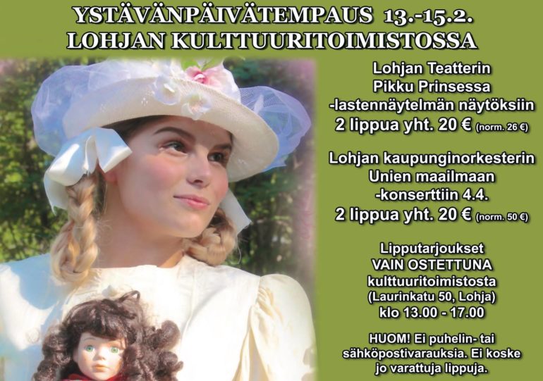 Tervetuloa Lohjan kulttuuritoimistoon 13.-15.2.2019 klo 13.00 – 17.00 moikkaamaan meitä sekä ostamaan lippuja Lohjan Teatterin Pikku prinsessa -satunäytelmään, Lohjan kaupunginorkesterin Unien maailmaan -konserttiin sekä tietysti Vaimoni on toista maata -komediaan ja orkesterin muihinkin konsertteihin!