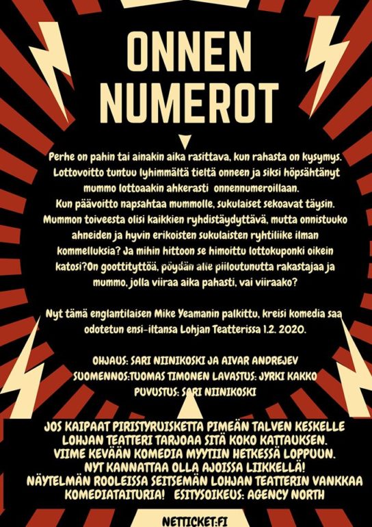 22.5.2019 Lohjan Teatterin esityskausi syksy 2019 – kevät 2020 Helteiset toukokuuterveiset Lohjan Teatterista! Lohjan Teatterin esityskausi syksy 2018 – kevät 2019 saatiin päätökseen toukokuussa. Pikku Prinsessaa kävi katsomassa reilut 2000 katsojaa ja saimme näytelmästä paljon kiittävää palautetta. Pääsylippujen hinnat: Lohjan kaupunki on tehnyt uuden sopimuksen lipunmyyntitoimisto NetTicketin kanssa, mikä tarkoittaa sitä, että kaikkiin lipun hintoihin sisältyy jatkossa 2 € palvelumaksu / lippu, joka tilitetään suoraan NetTicketille. Näin ollen joudumme myös korottamaan lipun hintoja 2 € / lippu. Eli Lohjan Teatterin liput ovat jatkossa niin internetissä kuin kaikissa (koskee myös teatterin toimistoa ja lipunmyyntipistettä teatterilla) muissakin lipunmyyntipisteissä samanhintaisia. Lastennäytelmässä käsiohjelma sisältyy jatkossa lipun hintaan. Tämä on mahdollista, koska teemme käsiohjelman itse. Lippujen hinnat kaudella 2019 – 2020: (kaikki hinnat sis. 2 € palv.maksu / lippu) *Musikaali perushinta 28 € eläkel., opiskelijat, työttömät, varusmiehet 26 € ryhmät alkaen 20 henk. 24 € koko sali (205 paikkaa) 4500 € *Komedia perushinta 22 € eläkel., opiskelijat, työttömät, varusmiehet 20 € ryhmät alkaen 20 henk. 17 € koko sali (205 paikkaa) 3400 € *Satunäytelmä perushinta 15 € ryhmät alkaen 10 henk. 14 € 100 lippua ja yli 13 € koko sali (205 paikkaa) 2500 € Tämän viikon alussa teatteritoimikunta näytti meille vihreää valoa tulevan esityskauden ohjelmiston osalta, joten pitemmittä puheitta saammeko esitellä: Tulossa huikea esityskausi syksy 2019 – kevät 2020, joka tarjoaa elämyksiä kaikenikäisille! Hiomaton timantti Upea hittimusikaali Marilyn Monroen elämästä Esityskausi 26.10. – 14.12.2019 Eppu Nuotio ja Tiina Brännare kirjoittivat muutamia vuosia sitten hittimusikaalin Marilyn Monroen elämästä ja menestyskonsepti oli taattu, koska päähenkilönä oli yksi elokuvataivaan kirkkaimmista ja kauneimmista tähdistä. Esitys nähtiin Kuopion kaupunginteatterissa, Tampereen työväenteatterissa ja Mikkelin teatterissa. Musikaalin materiaalia riittää, sillä Marilynin elämästä ei dramatiikkaa puuttunut ja Lohjan Teatterissa tarina kerrotaan tutun, ihanan nostalgisen musiikin siivittämänä. Tässä ajassa, kun moni tavoittelee tähteyttä keinolla millä hyvänsä, Marilynin tarina on edelleen ajankohtainen ja todellakin kertomisen arvoinen. Menestyksen kääntöpuolia ovat usein yksinäisyys ja ikuinen kaipuu löytää se oikea ja aito rakastettu. Kaipuu saada rakastaa ja tulla rakastetuksi omana itsenään ilman kuuluisuuden taakkaa. Musikaali kertoo tarinan äitinsä hylkäämästä, orpokodista ja sijoitusperheestä toiseen kiertävästä pikkutytöstä maailmanluokan tähdeksi. Hienosti kirjoitettu, takaumia täynnä oleva kasvutarina lahjakkaasta naisesta, joka ajautuu väärille teille. Marilynin tunnetuimmat laulut soivat musikaalissa ja myös tuttuja miehiä vilahtaa tarinassa isommissa ja pienemmissä rooleissa, kuten Frank Sinatra ja Joe DiMaggio, Kennedyn veljekset. Nähdäänpä hauskoja kohtauksia muutamista elokuvistakin kuten esim.: Piukat paikat. Lohjan Teatterin voidaan jo sanoa erikoistuneen elämänkertamusikaaleihin ja tälläkin kertaa Marilynin tarina kerrotaan pieteetillä ja suurella sydämellä. Nuotio ja Brännare ovat saaneet kiitosta näytelmän erilaisesta rakenteesta, jossa käsitellään myös kuuluisuuden nurjia puolia ja draamavoittoinen esitys sopii hyvin Lohjan Teatterin ohjelmistoon. Näytelmä rakenne ruokkii myös mielikuvitusta, joten visuaalinen elämys on taattua Lohjan Teatterin laatua lavastuksineen, pukuineen ja valoineen. Mukana menossa nähdään myös säihkyväsäärinen tanssiryhmä. Musikaali Hiomaton Timantti 20 näytöstä la 26.10. klo 19.00 ensi-ilta to 31.10. klo 19.00 pe 1.11. klo 19.00 to 7.11. klo 19.00 pe 8.11. klo 19.00 la 9.11. klo 16.00 to 14.11. klo 19.00 pe 15.11. klo 19.00 la 16.11. klo 16.00 to 21.11. klo 19.00 pe 22.11. klo 19.00 la 23.11. klo 14.00 to 28.11. klo 19.00 pe 29.11. klo 19.00 la 30.11. klo 19.00 to 5.12. klo 19.00 la 7.12. klo 19.00 to 12.12. klo 19.00 pe 13.12. klo 19.00 la 14.12. klo 14.00 Keväällä jatkamme menestyskomedioiden linjaa: ONNENNUMEROT Mike Yeamanin palkittu menestyskomedia Esityskausi 1.2. – 6.3.2020 Perhe on pahin tai ainakin aika rasittava, kun rahasta on kysymys. Lottovoitto tuntuu lyhyimmältä tieltä onneen ja siksi höpsähtänyt mummo lottoaakin ahkerasti onnennumeroillaan. Kun päävoitto napsahtaa mummolle, sukulaiset sekoavat täysin. Mummon toiveesta olisi kaikkien ryhdistäydyttävä, mutta onnistuuko ahneiden ja hyvin erikoisten sukulaisten ryhtiliike ilman kommelluksia? Ja mihin hittoon se himoittu lottokuponki oikein lopulta katosi? On goottityttöä, pöydän alle piiloutunutta rakastajaa ja mummo, jolla viiraa aika pahasti, vai viiraako? Kommelluksia, väärinkäsityksiä ja jekutuksia täynnä oleva komedia jatkaa viime keväänä hyväksi havaittua linjaa tuoda iloa ja valoa alkutalven ankeuteen. Onnennumerot –komediaa on esitetty kuluvan vuoden aikana täysille saleille ympäri Suomea. Tämä vahvasti nykypäivään linkittyvä huumoripläjäys tarjoaa samaistumispintaa ja hersyviä hetkiä. Näytelmää katsoessa herää kysymys, tuoko raha sittenkään onnea ja onko se suku aina kuitenkaan pahin? la 1.2. klo 19.00 Ensi-ilta to 6.2. klo 19.00 pe 7.2. klo 19.00 la 8.2. klo 16.00 to 13.2. klo 19.00 pe 14.2. klo 19.00 la 15.2. klo 14.00 to 20.2. klo 19.00 pe 21.2. klo 19.00 la 22.2. klo 16.00 to 27.2. klo 19.00 pe 28.2. klo 19.00 la 29.2. klo 16.00 to 5.3. klo 19.00 pe 6.3. klo 19.00 Saapasjalkakissan seikkailut Huikean hauska ja jännittävä koko perheen satuseikkailu Esityskausi: 4.4. – 9.5.2020 Kuka onkaan kulmakunnan komein ja ovelin? Kuka hurmaa sanankääntein hupaisin? Kuka tanssii ja taistelee kaikki muut pyörryksiin? Hauska tarina alkaa siitä, kun kolme rie