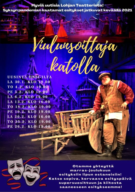 23.11.2020 Viulunsoittaja katolla esitykset pandemiarajoitusten takia peruttu. Esitykset jatkuvat tammi-helmikuussa! Pahoitellen ilmoitamme, että VIULUNSOITTAJA KATOLLA musikaalin esitykset marras-joulukuun osalta peruttu Avin antamien ohjeiden mukaisesti. Onneksi saamme siirrettyä loput musikaaliesitykset tammi-helmikuulle 2021 Elling näytelmän tilalle. OTAMME YHTEYTTÄ sähköpostitse tai puhelimitse KAIKKIIN LIPUN JO OSTANEISIIN JA VARANNEISIIN muutaman viikon sisällä. Lahjakortit ja siirrot tuleviin esityksiin mahdollisia. Huomioithan, että teatteri ei voi ostaa takaisin jo lunastettuja lippuja. Toivomme kaikilta rauhallista joulumieltä ja kärsivällisyyttä tässä tilanteessa! Koko työryhmä odottaa innoissaan mahdollista jatkoa suosituille esityksille!