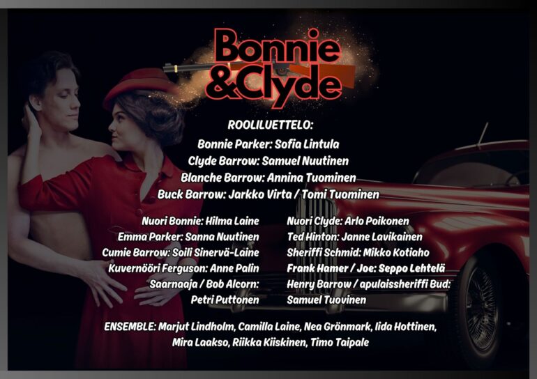 Musikaalin pääosissa Bonniena ja Clydena nähdään upeat, teatteristamme tutut laulajanäyttelijät Sofia Lintula ja Samuel Nuutinen. Mukana menossa myös suuri joukko muita Lohjan Teatterin lahjakkaita näyttelijöitä.