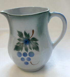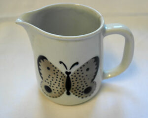 Valkoinen kannu, jossa sininen perhonen ja yläreuna sekä vihreää heinäkuviota.