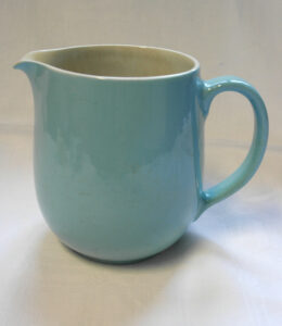 Vaaleansininen pieni kannu, jonka sisäpuoli on valkoinen.