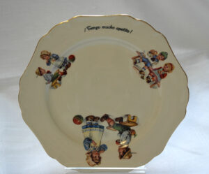 Tämä vientiin tarkoitettu AG-mallin lastenlautanen on koristettu lapsiaiheisilla kuvilla. Lautasessa lukee espanjaksi: ”¡Tengo mucho apetito!” AG-mallia tuotettiin 1934‒1940.