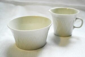 Verkkokuvioiset kermakko ja sokerikko ovat LE-mallia. Ne on valmistettu luunvärisestä sävyposliinista. Mallia valmistettiin 1950- ja 1960-lukujen vaihteessa.