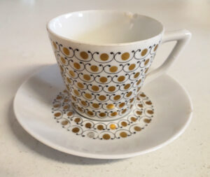 Kuppipari on DB-mallia. Kultatäpläinen ornamenttikuvio on Esteri Tomulan suunnittelema Mekka. Kuppi on ollut tuotannossa 1963–1969.