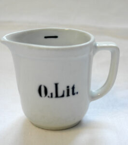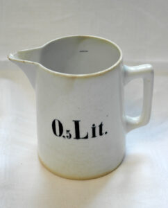 Mittakannu on MK-mallia, joka oli tuotannossa 1906‒1935. Kannun kyljessä on sen tilavuus ja sisällä pieni mittamerkki. Leiman perusteella tämä kannu on valmistettu vuosien 1928 ja 1932 välillä.